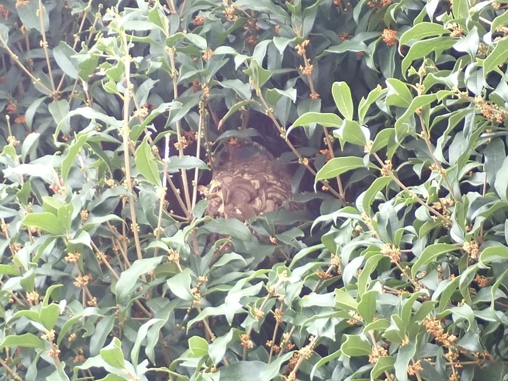 立派な金木犀の高所部分にコガタスズメバチが営巣