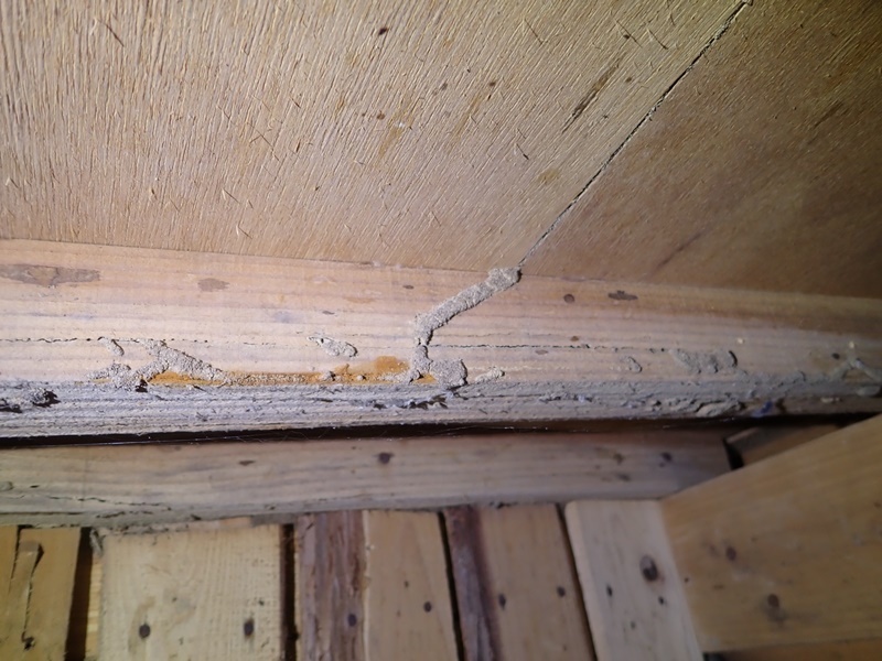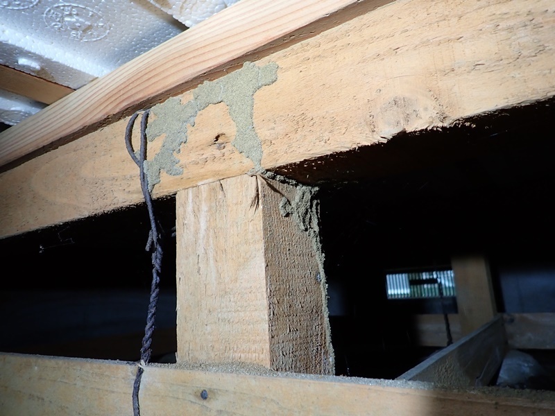 木材(大引き)表面に広がる蟻道 束柱をのぼってきています