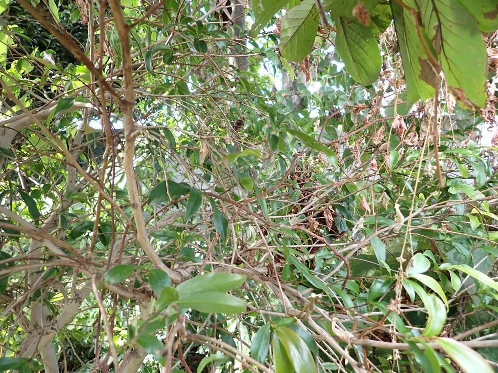 民家の樹木にスズメバチの巣が!目線の高さなのですが、建物から見て巣の手前に樹木があるため今まで気づかなかったそう。怖いので早急に駆除してほしいとご依頼いただいたので即日駆除にうかがいました。