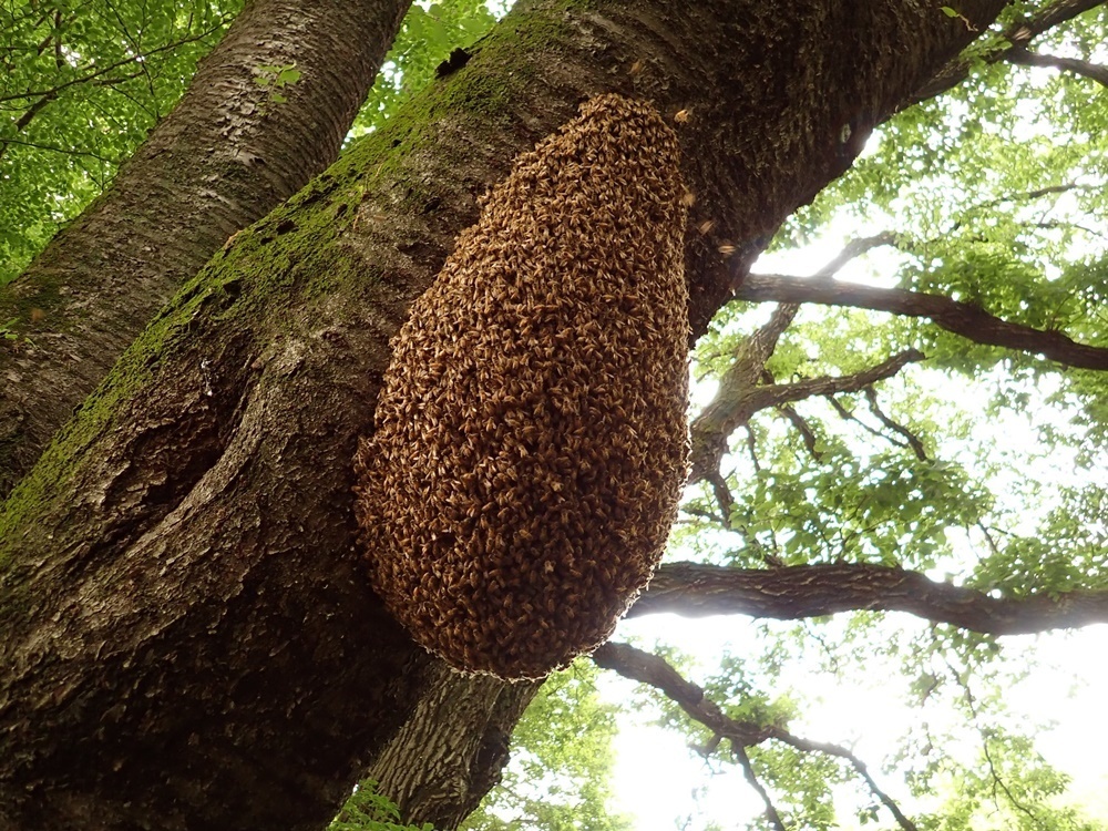 博物館職員の方より大量のミツバチが木にとまっているとご報告を受け伺いました。ミツバチの習性である分蜂かと思いきや蜂をよけるとしっかりと蜂の巣が作られていました。巣作りの場所としては閉鎖空間を好むミツバチでもこういった解放空間に巣を作ることもまれにあるという例です。
