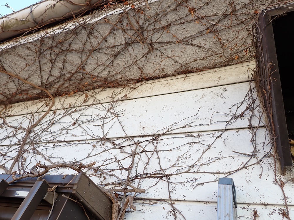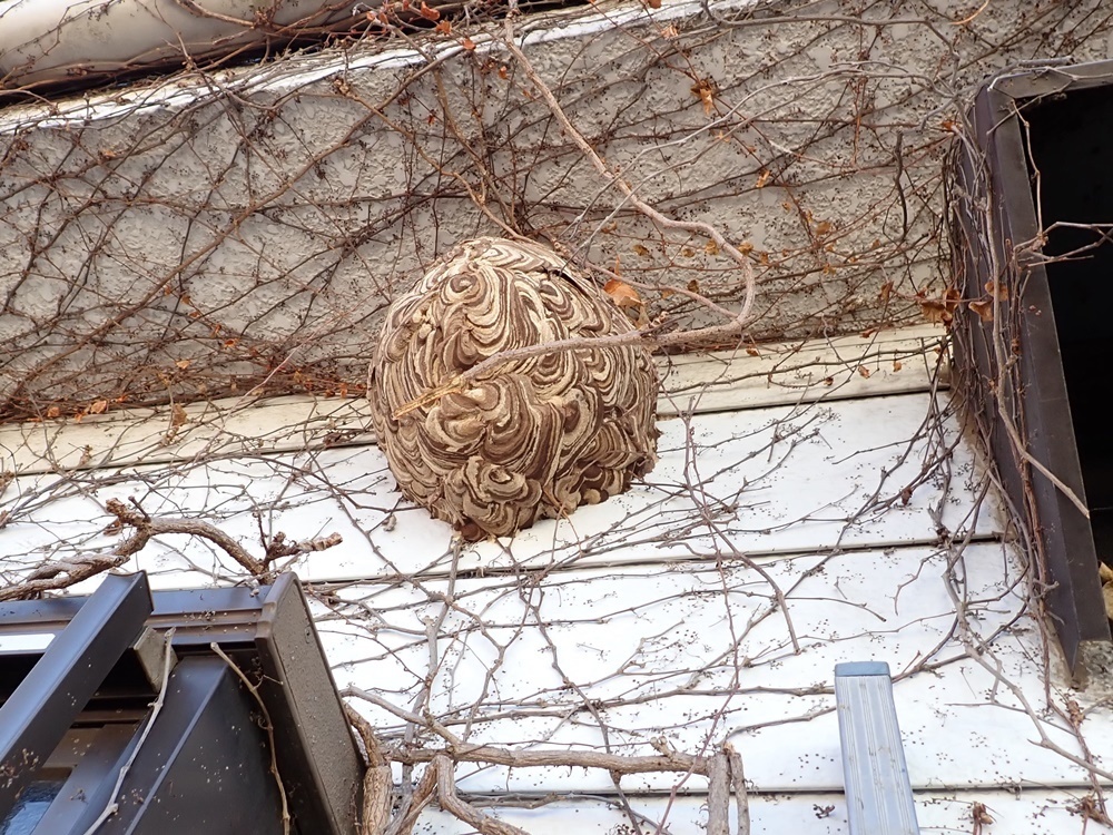 蔦が絡まるお家はスズメバチ、アシナガバチともに巣を作られやすいです。営巣最初期は蔦に巣を付け、巣が大きくなるにつれ外壁などにもべったりと固定します