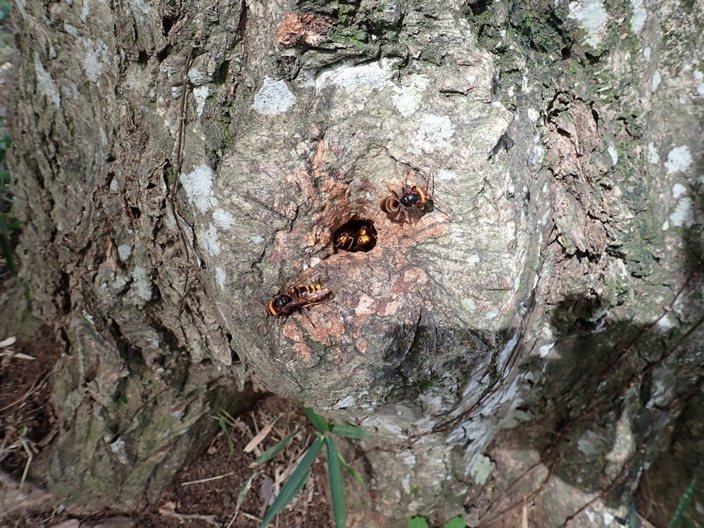 小さな穴より出入りするモンスズメバチ 巨木なのでこの中にある大きな空間に巣を作っている