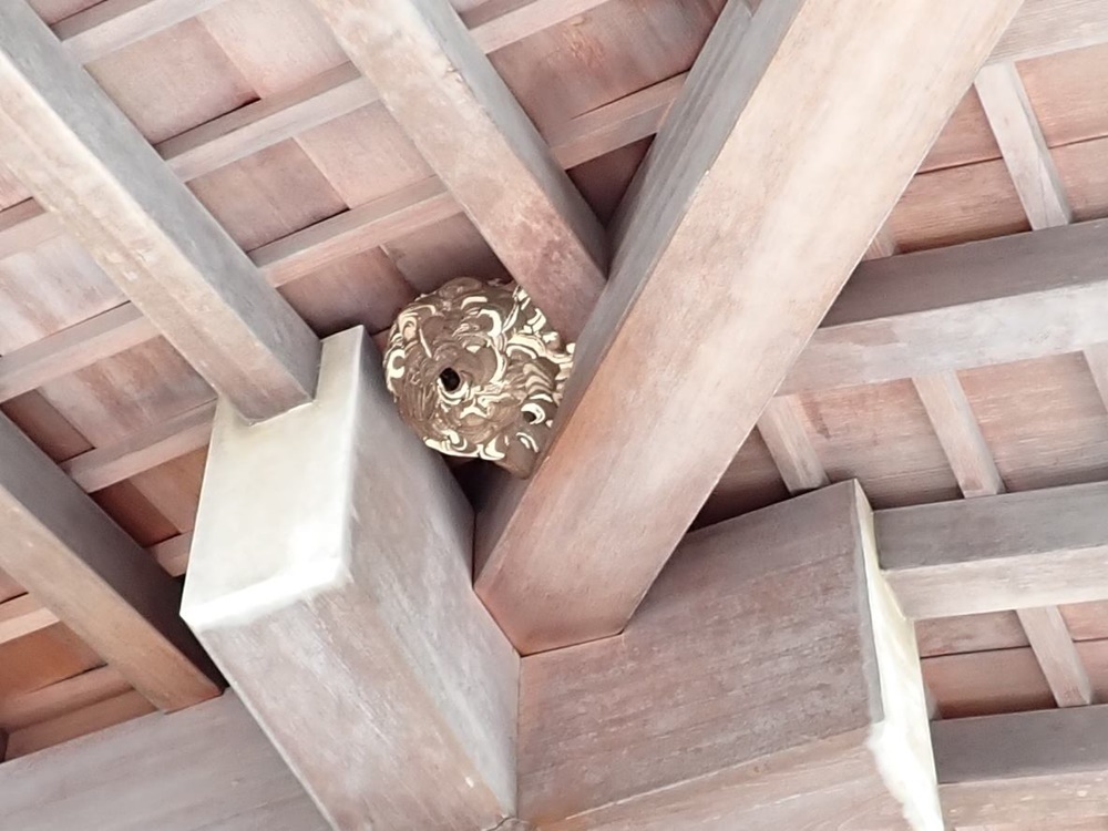 お寺の軒下に営巣したスズメバチ駆除をいたしました。八月なのでまだまだ成長途中といった大きさの巣ですが、お盆前に駆除をしたいとご住職よりご依頼いただいたのでもちろんその日のうちに駆除にうかがわせていただきました。
