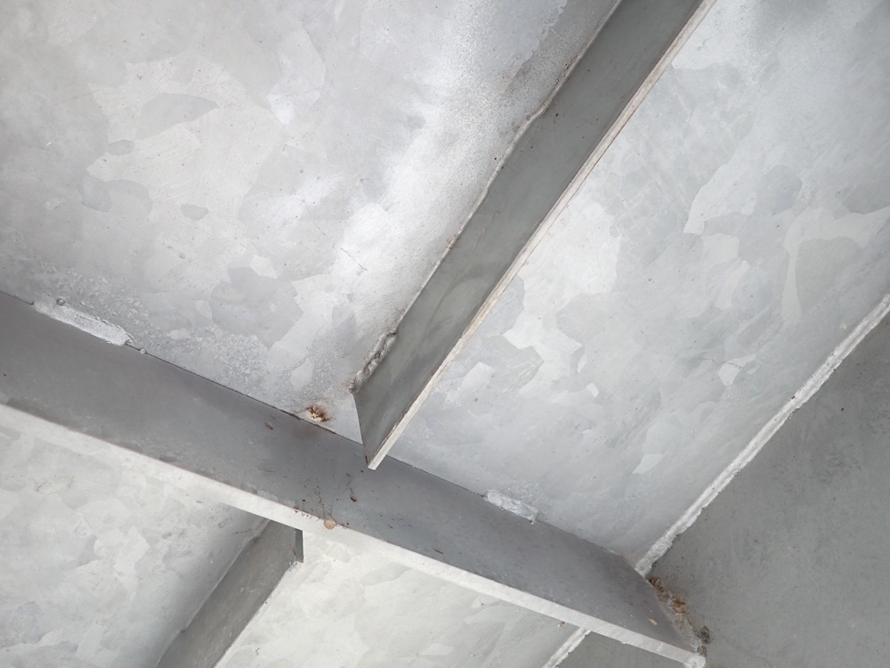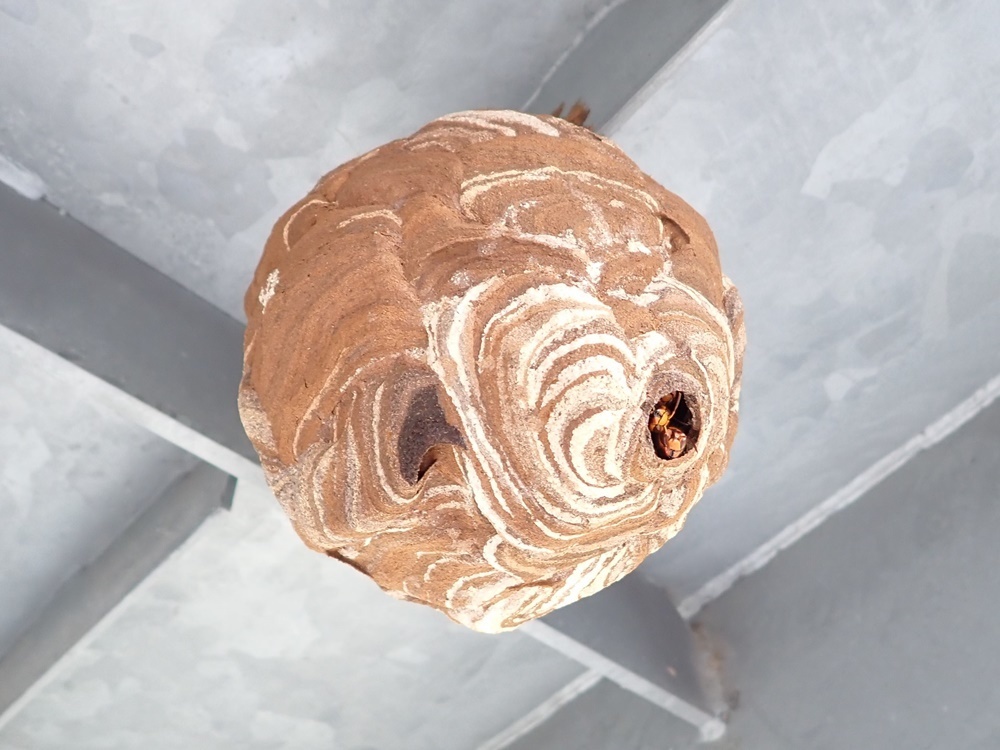 企業様の外階段踊り場裏に作られたコガタスズメバチの駆除。下が駐輪場なので早めに駆除をしてほしいとご依頼いただきました。