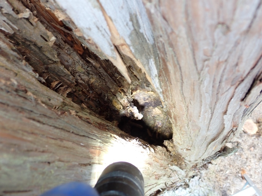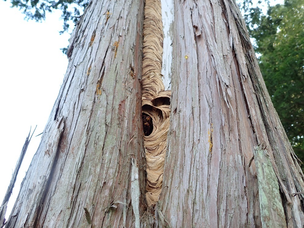 とても長い木の裂け目を塞ぐように巣を形成するモンスズメバチによく見られる状態