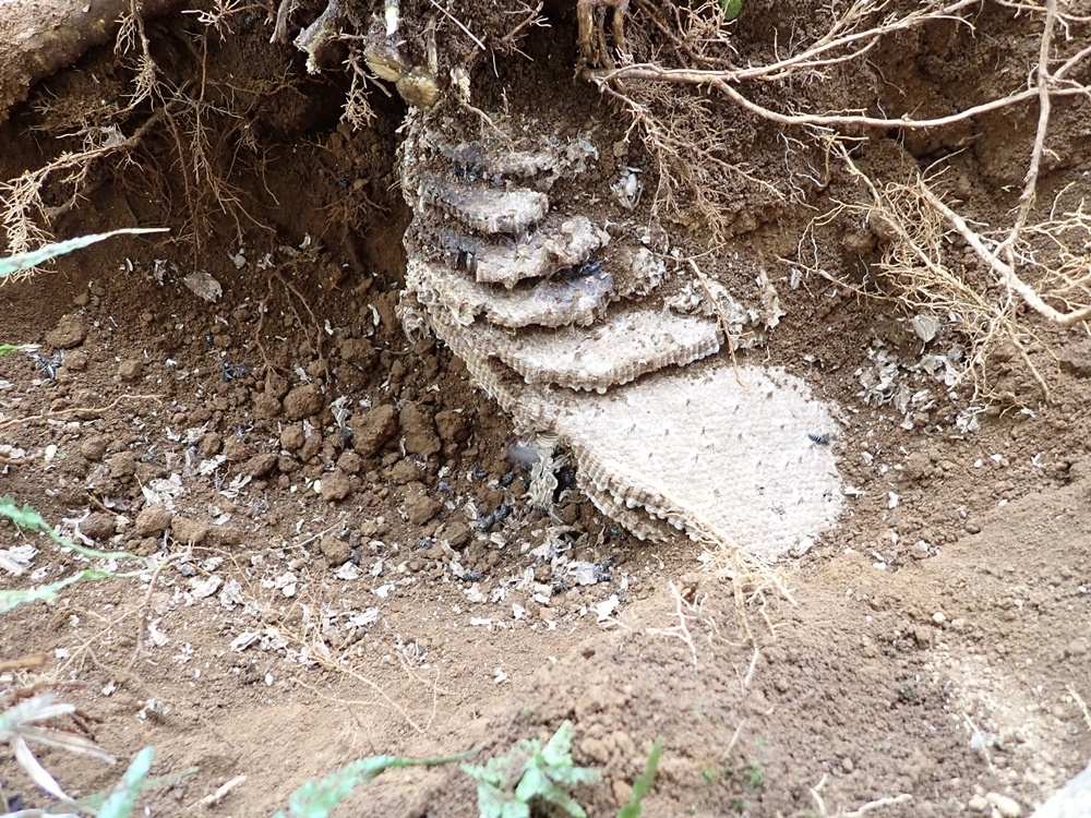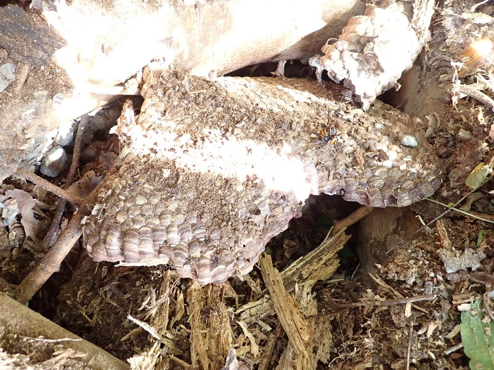 周りの土を掘り起こした様子。立派なクロスズメバチの巣です