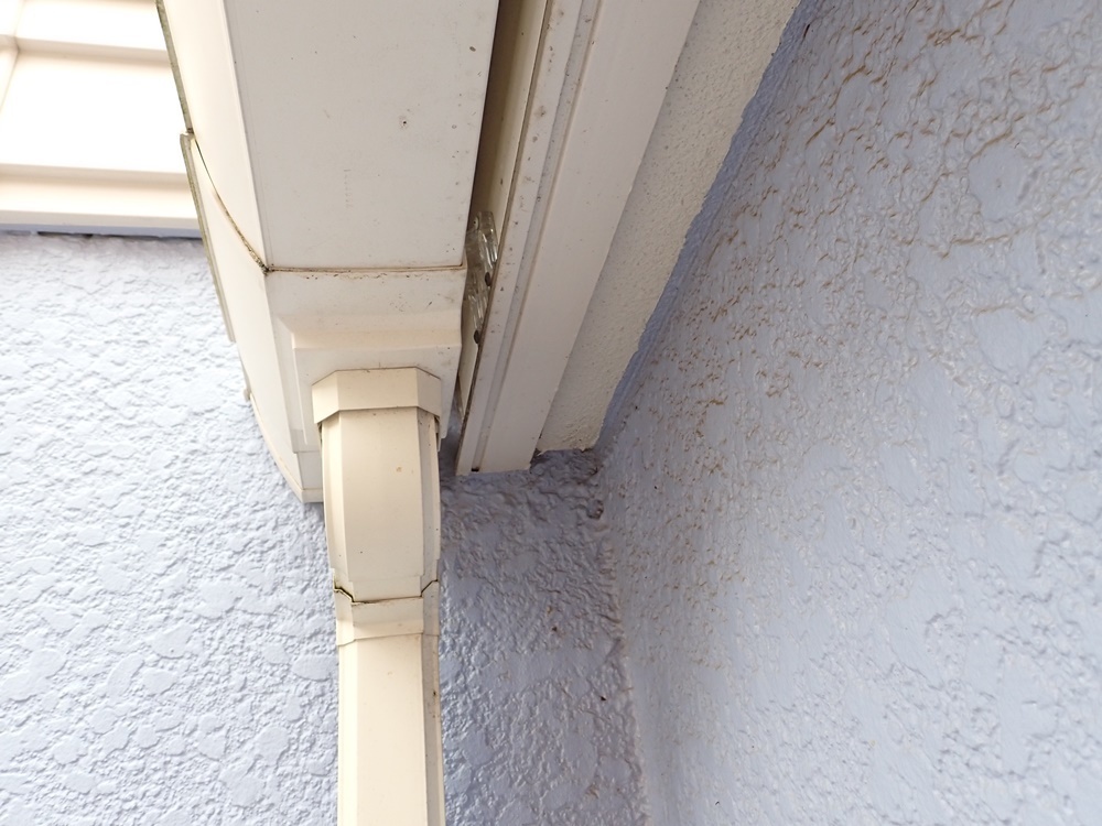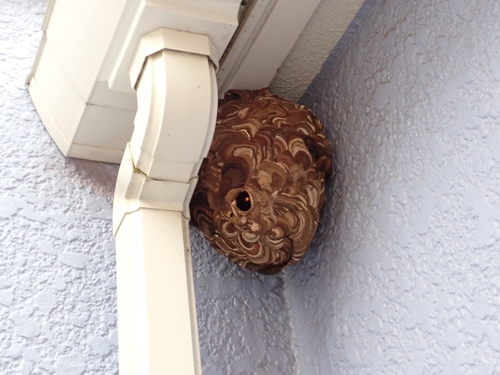 軒下で雨どいに隠れるように作られたスズメバチ駆除をご依頼いただきました