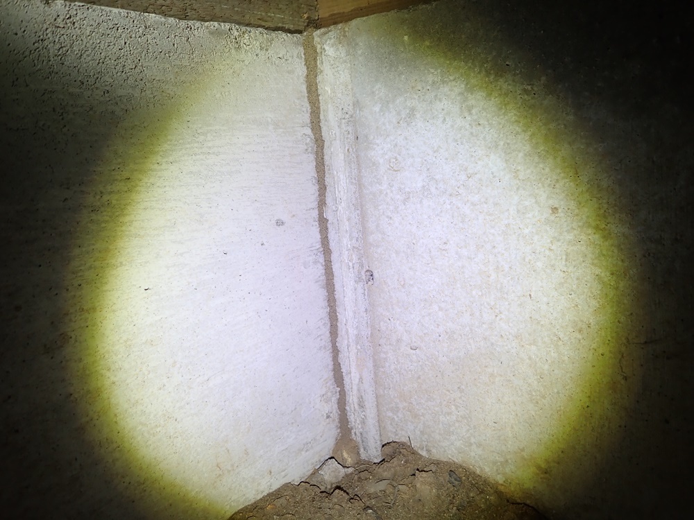 布基礎の為土がまる出しの床下で蟻道が基礎を通り一直線に土台まで登っています