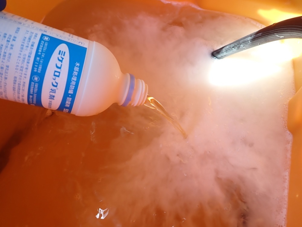 しっかり穴を開けていると、薬剤がドバドバ入ります。終わったらセメントで穴を塞いで完了